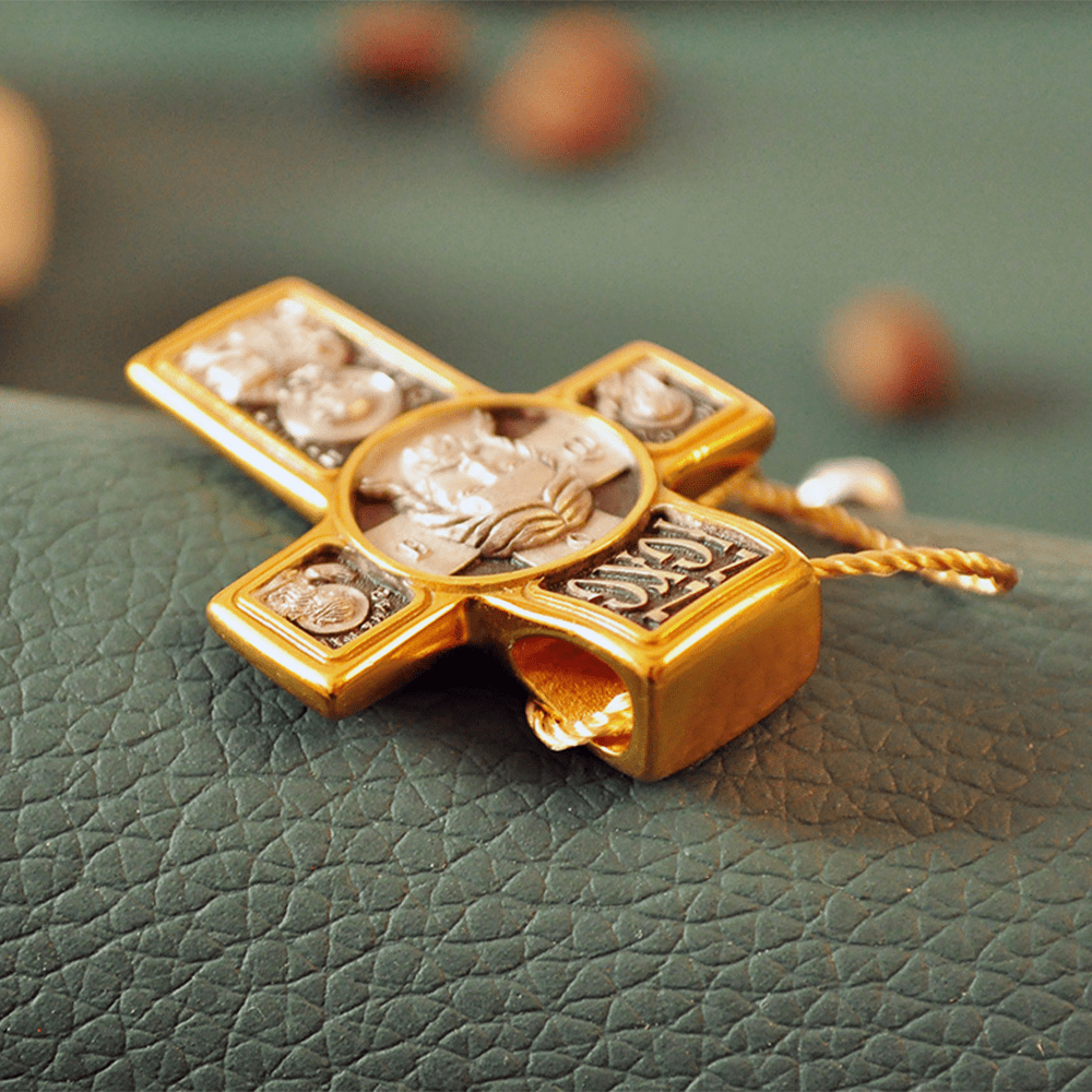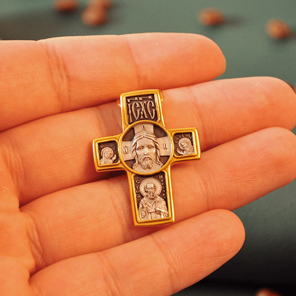 Dieser Kreuzanhänger mit Jesus- und Heiligenikone ist ein meisterhaftes Andachtsschmuckstück, das sorgfältige Handwerkskunst und feine religiöse Kunst zeigt. Der aus hochwertigen Materialien gefertigte Anhänger zeigt detaillierte Figuren von Jesus und verehrten Heiligen, hervorgehoben durch komplizierte Designs, die historische und spirituelle Kunstfertigkeit widerspiegeln. - Heiliges doppelseitiges Design