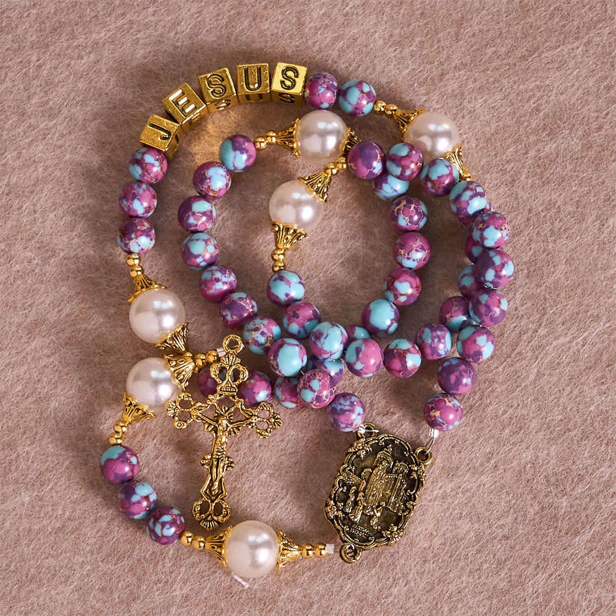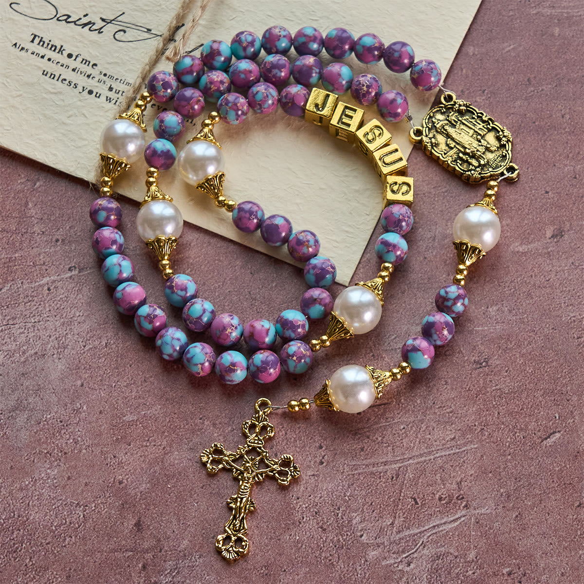Dieser exquisite, handgefertigte Rosenkranz vereint Glauben, Schönheit und Hingabe in einer königlichen Farbpalette aus Purpur und Gold. Er besteht aus Perlen aus Imperial Stone und ist mit einem goldenen Kruzifix, einem Marienbildnis in der Mitte sowie personalisierten Buchstabenblöcken mit dem Schriftzug „JESUS“ verziert. Er spiegelt die Majestät der göttlichen Liebe wider – ein Gebet in künstlerischer Form.