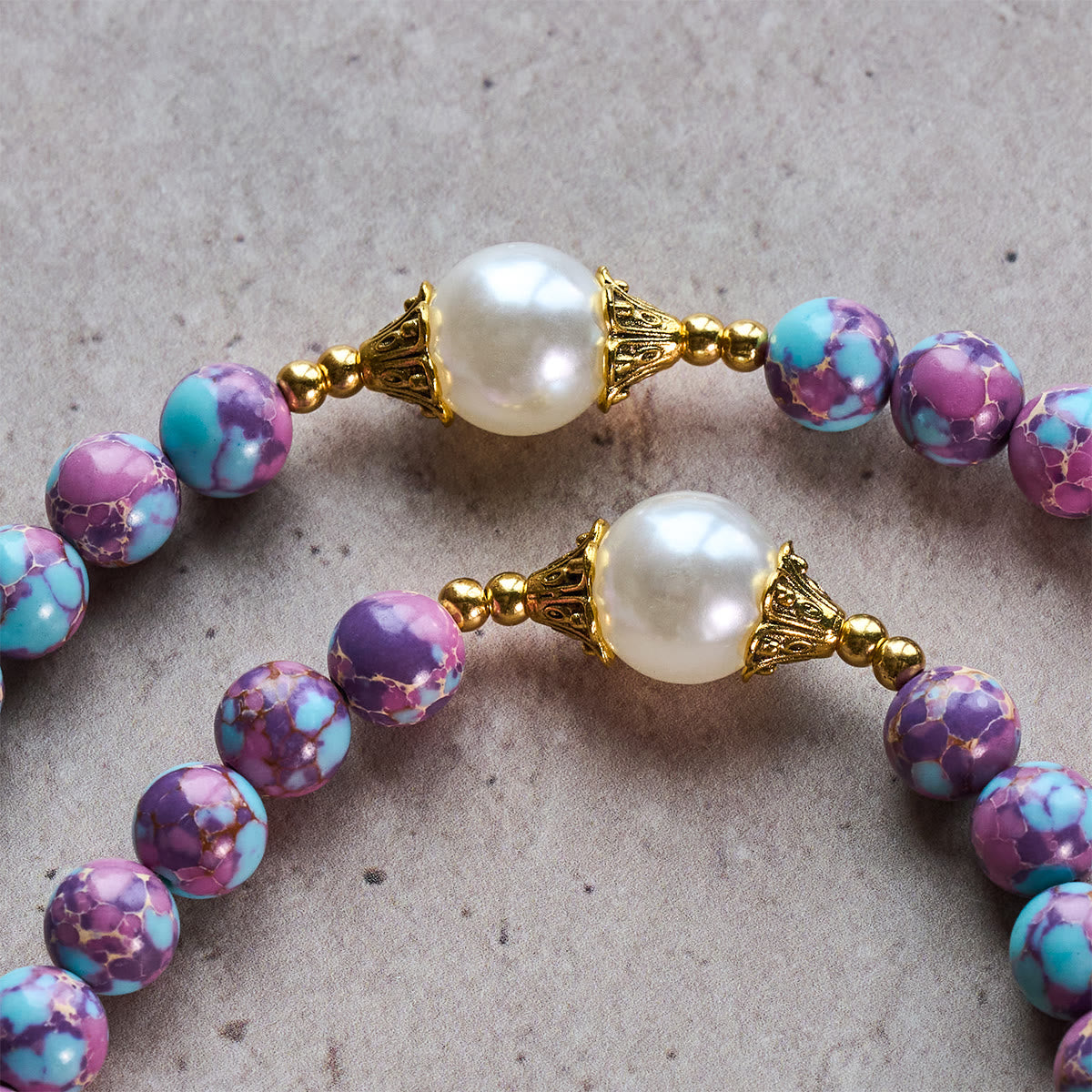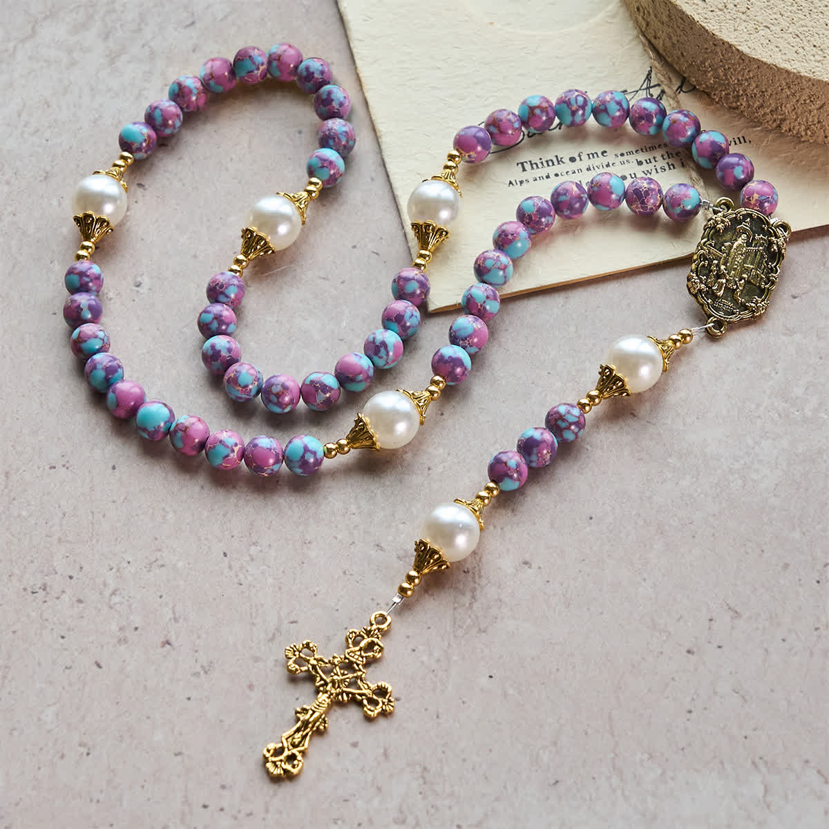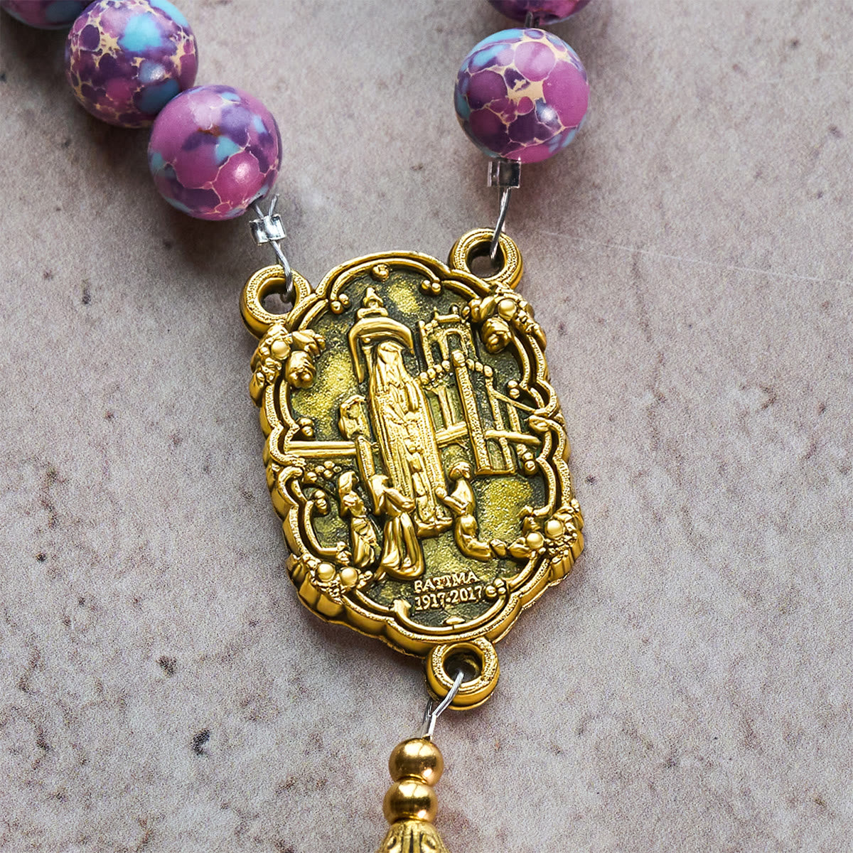 Jede Perle strahlt eine heilige Tiefe aus: Die violetten Kaisersteine symbolisieren Reue, Heiligkeit und königliche Würde – die Farbe von Christi Königtum und seiner Passion. Ihre marmorierten Töne spiegeln die Geheimnisse des Glaubens selbst wider – einen stillen Weg von der Trauer zur Erlösung, vom Gebet zum Frieden.