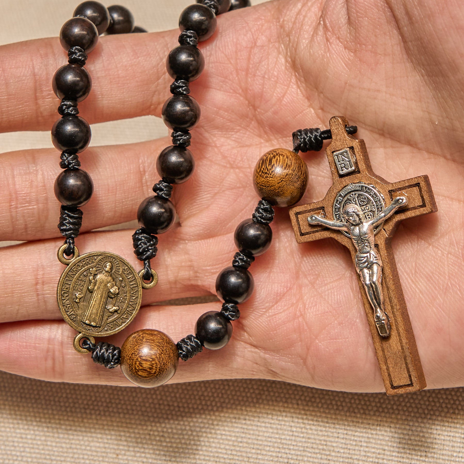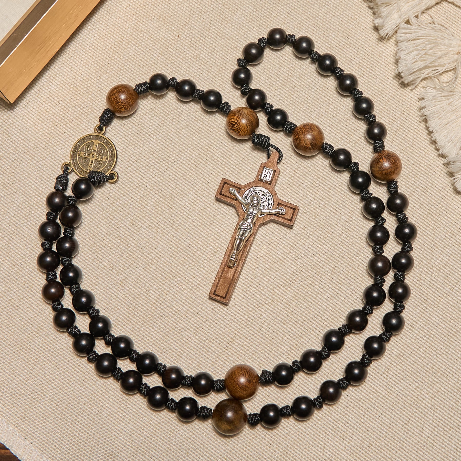 Christianartworkshop St. Benedikt-Medaille und Kruzifix aus schwarzen runden Holzperlen, gesegneter Andachtsrosenkranz