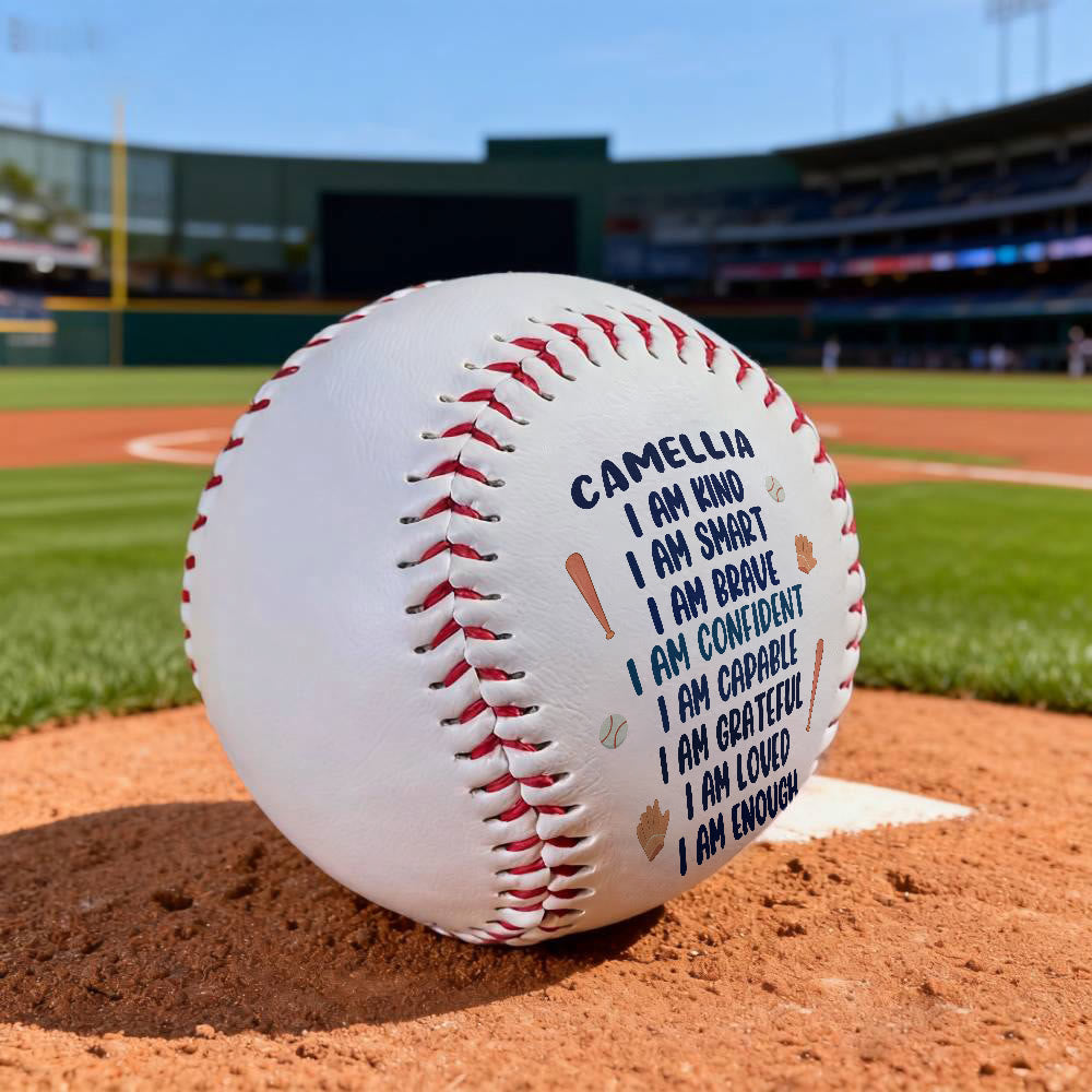 Dieser Baseball, gefertigt aus strapazierfähigem Leder und mit kräftigen roten Nähten, trägt personalisierte Botschaften wie „Ich bin geliebt, genug“ – ein Spiegelbild der Wahrheit, in Gottes Augen wertvoll zu sein.