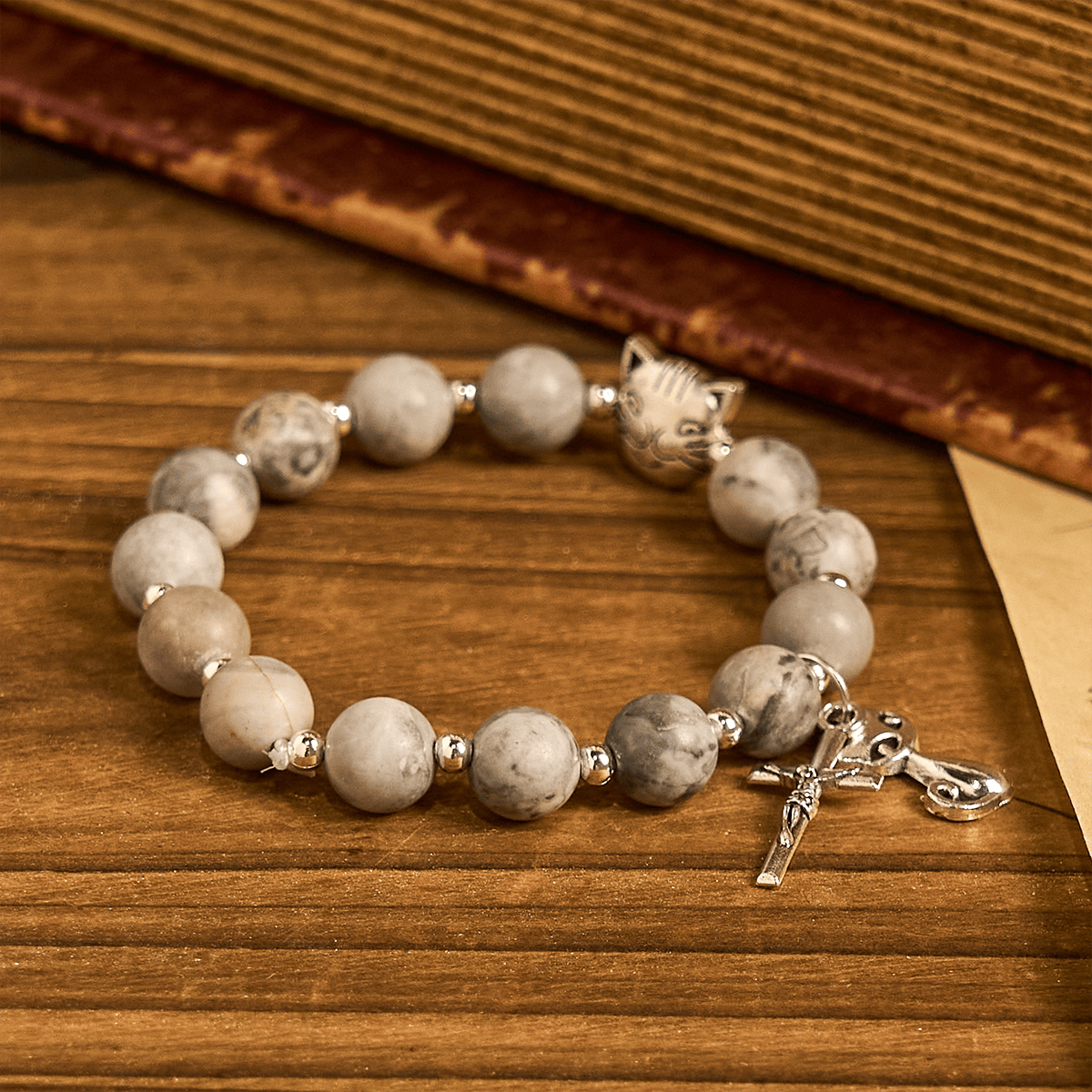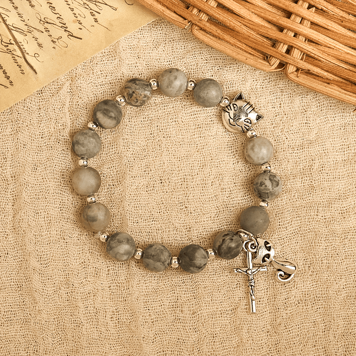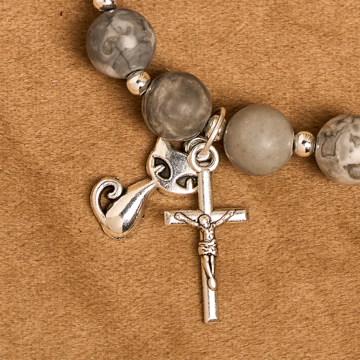 Gleichmäßig verteilte Perlen setzen einen sanften Akzent für Fürbitte und Dankbarkeit; das neutrale Grau lässt sich leicht im Alltag tragen. Das Kruzifix verkündet die selbstlose Liebe Christi und ruft uns zu konkreter Fürsorge auf – beten, füttern, retten, beschützen –, damit jede streunende Katze Sicherheit und Ruhe findet. - Einzigartiges und bedeutungsvolles Geschenk