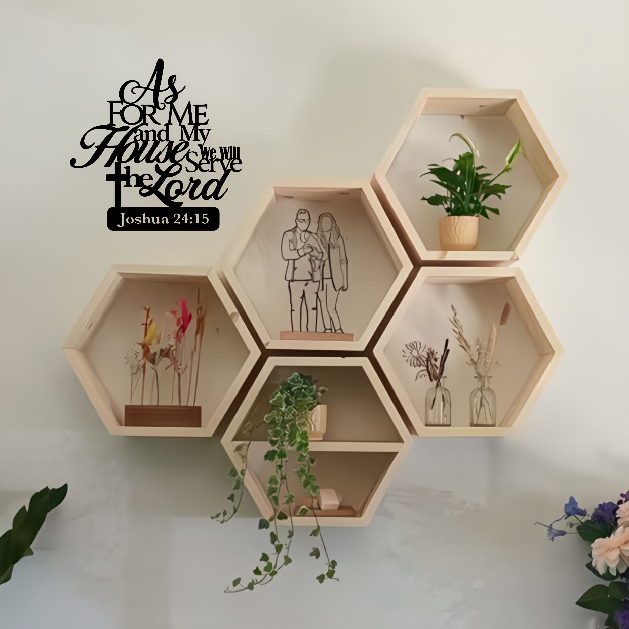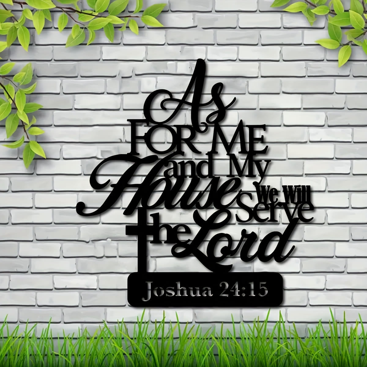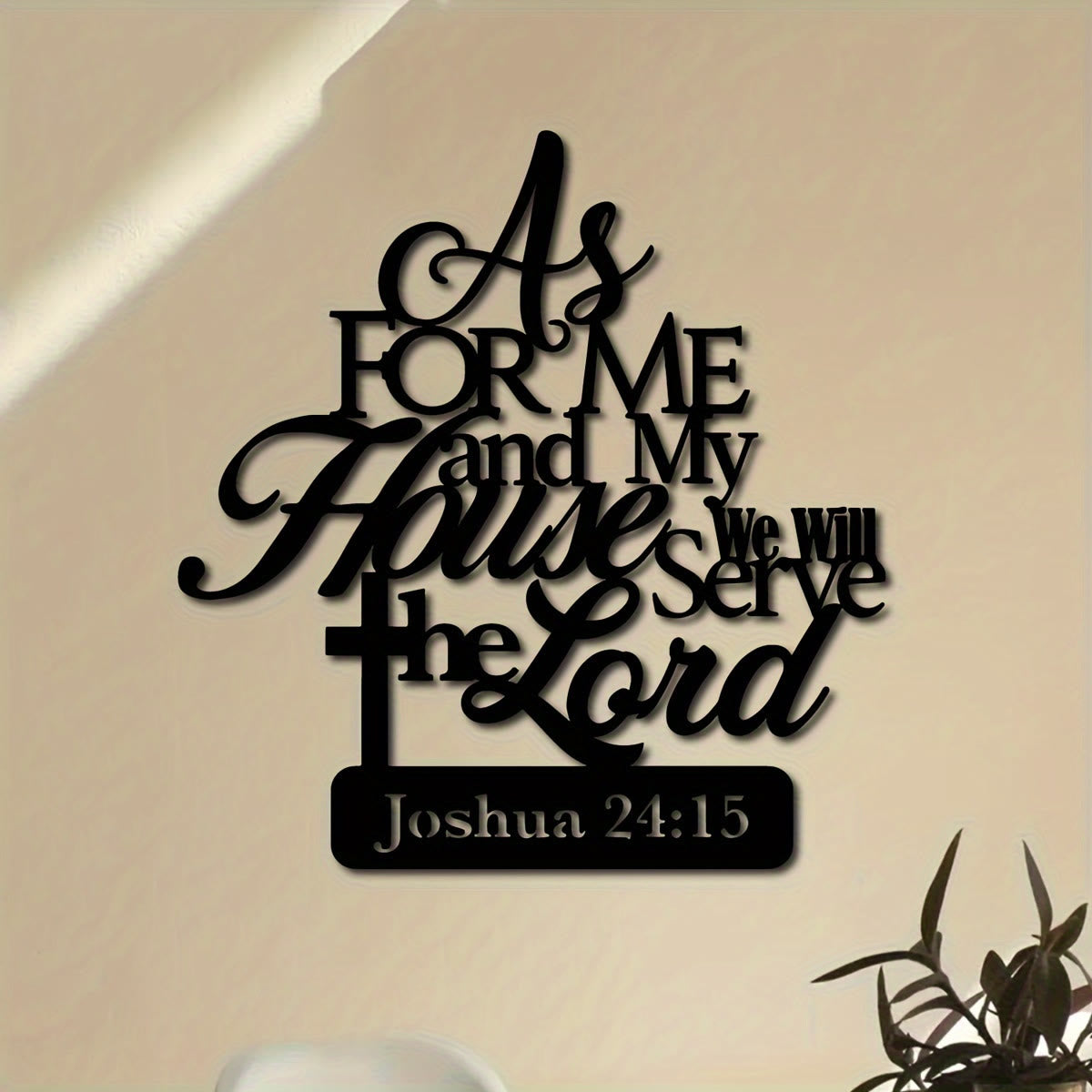 Der fließende Vers „Ich aber und mein Haus, wir wollen dem Herrn dienen“ (Josua 24,15) verkündet ein Versprechen für die ganze Familie. Der Kreuzsockel symbolisiert Christus als unser Fundament, während die übereinanderliegenden Buchstaben die Familie unter einem gemeinsamen Bekenntnis des Glaubens und des Gehorsams vereinen. - Sorgfältige Handwerkskunst, dauerhafte Schönheit
