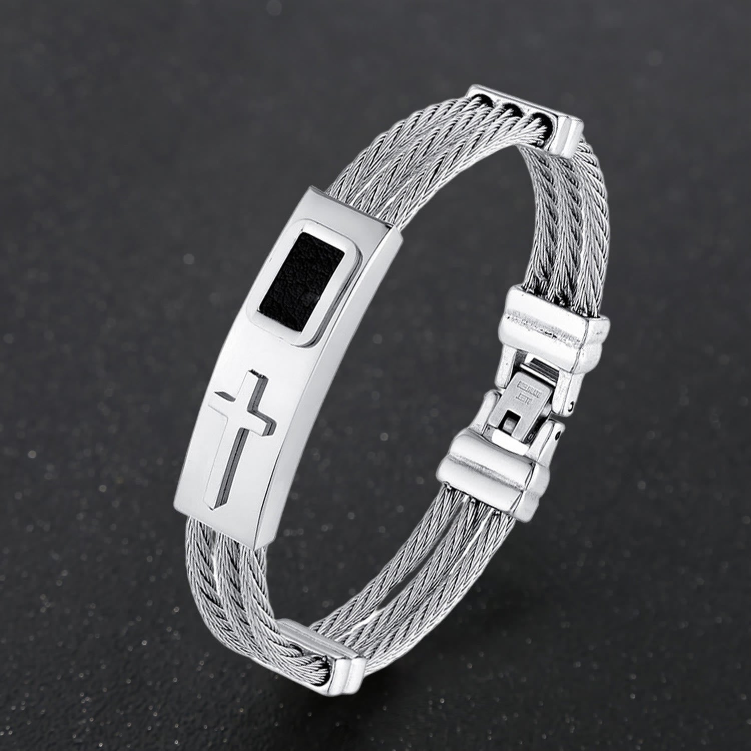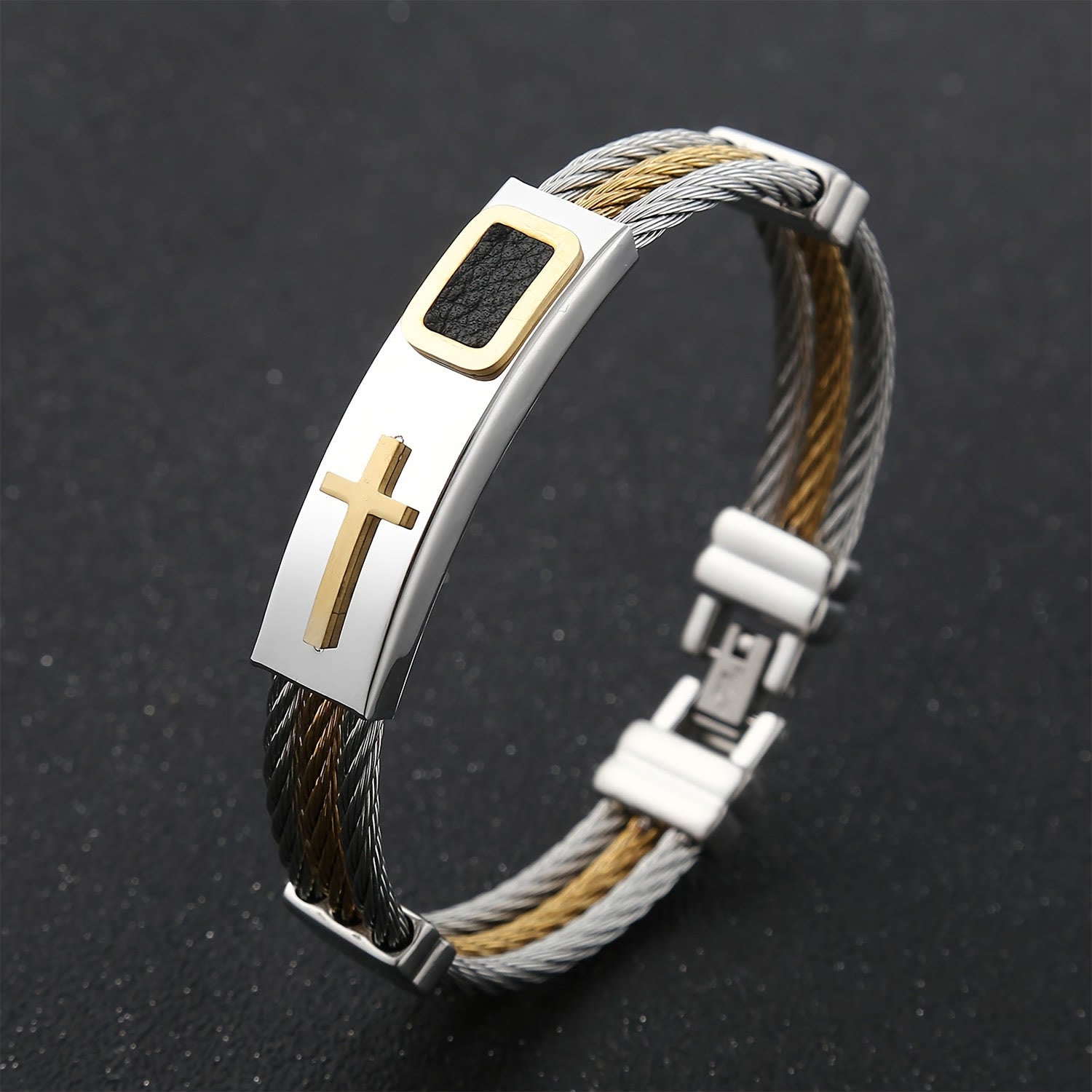 Dieses Armband aus ineinander verschlungenen Metallkabeln und einem polierten Kreuz vereint kühnen Stil mit religiöser Bedeutung – perfekt, um den Glauben auszudrücken. - Ein bedeutungsvolles Geschenk des Glaubens und der Identität
