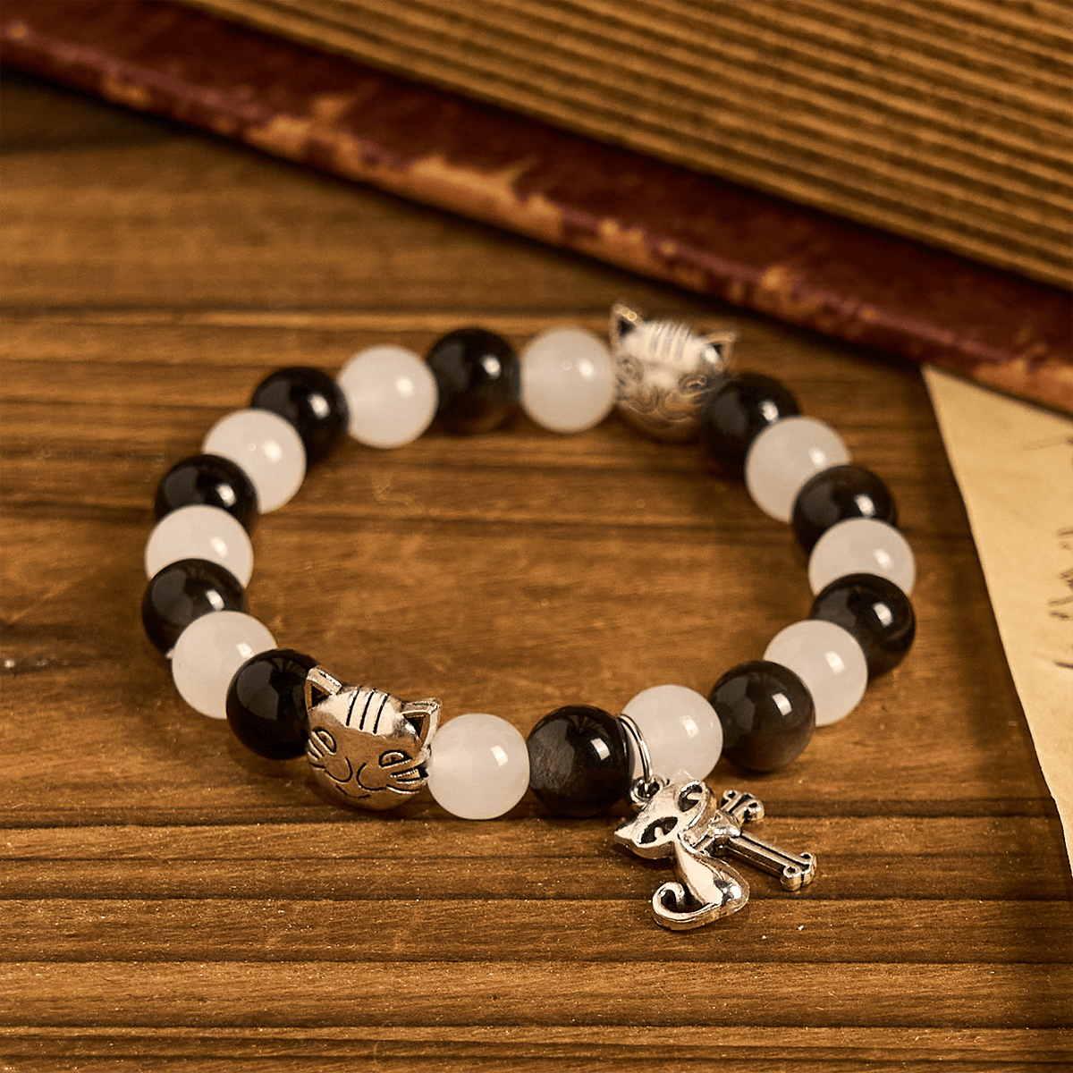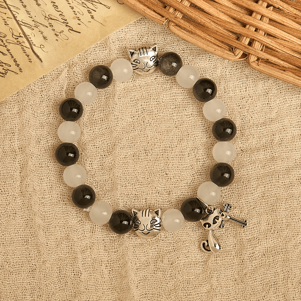 Dieses Tierarmband besteht aus abwechselnd schwarz-weißen Perlen mit zwei Kuh-Katzen-Anhängern und einem winzigen Kreuz – schlicht, modern und dafür gemacht, das Gebet für Haustiere und Streuner immer griffbereit zu haben. - Geführt von Unserer Lieben Frau, Kreuz der Barmherzigkeit