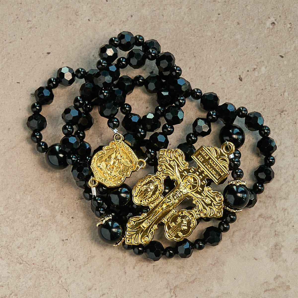Dieser handgefertigte Rosenkranz aus facettierten schwarzen Perlen vereint die Andacht zum Heiligen Michael und ein Vergebungskruzifix und bringt Schutz und Barmherzigkeit in jedes Jahrzehnt. - St. Michael: Verteidiger und Führer
