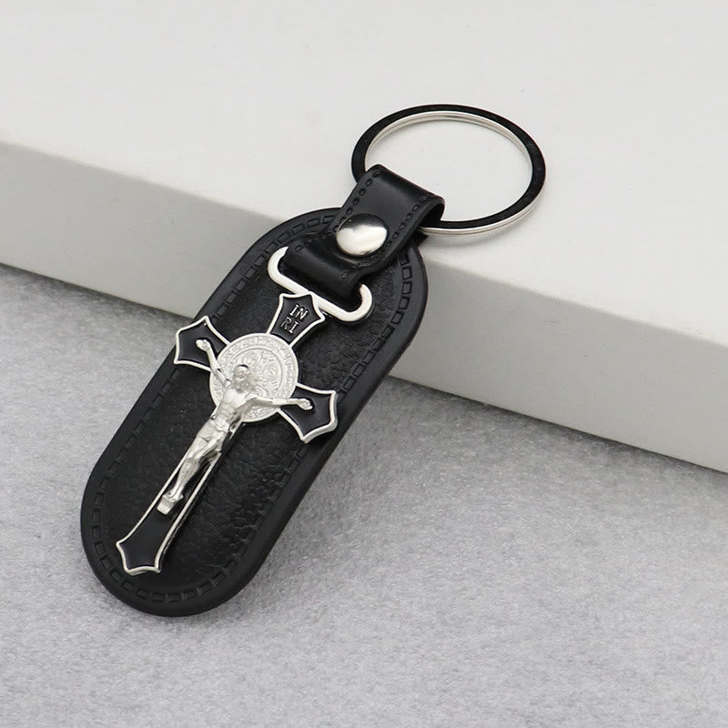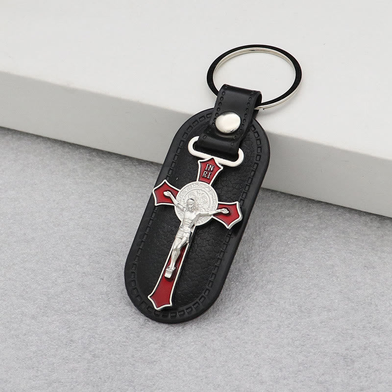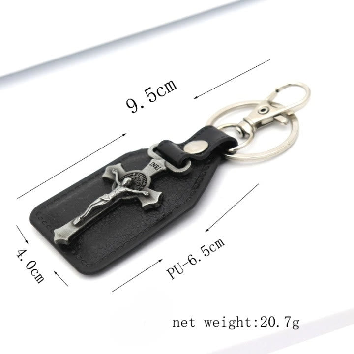 Stilvoller farbiger Kruzifix-Schlüsselanhänger auf Leder: Spirituelles Andenken für gläubige Seelen