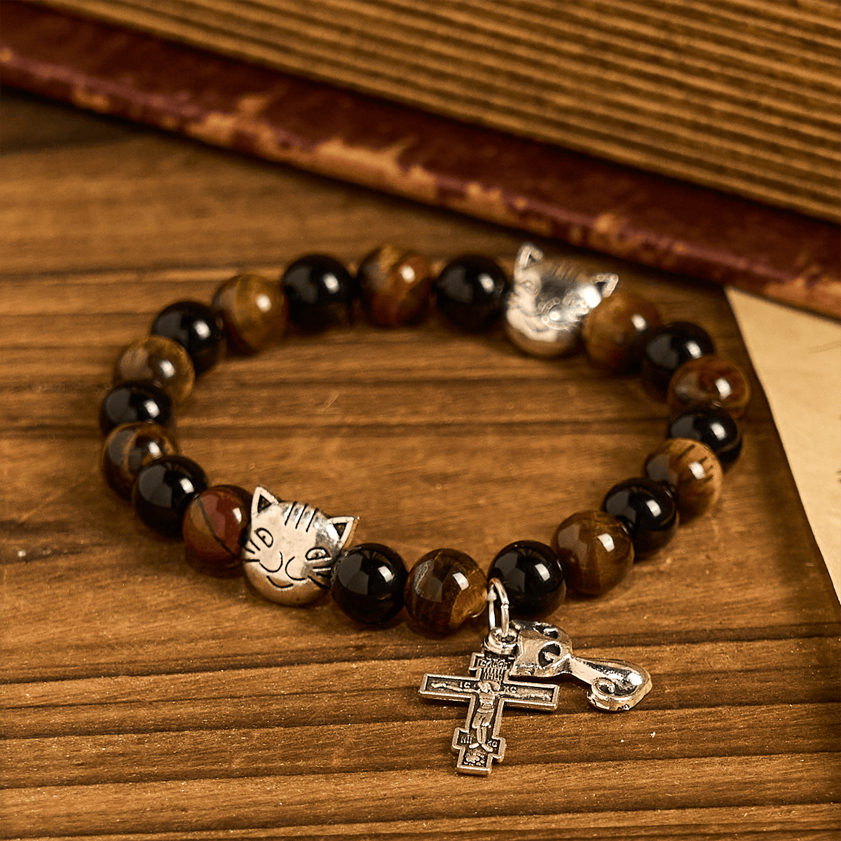 Dieses Tierarmband besteht aus warmen braun-schwarzen Perlen mit zwei getigerten Katzenanhängern und einem kleinen Kruzifix – gemacht, um Gebete für Haustiere und Streuner immer griffbereit zu haben. - Farben, die von Fürsorge sprechen
